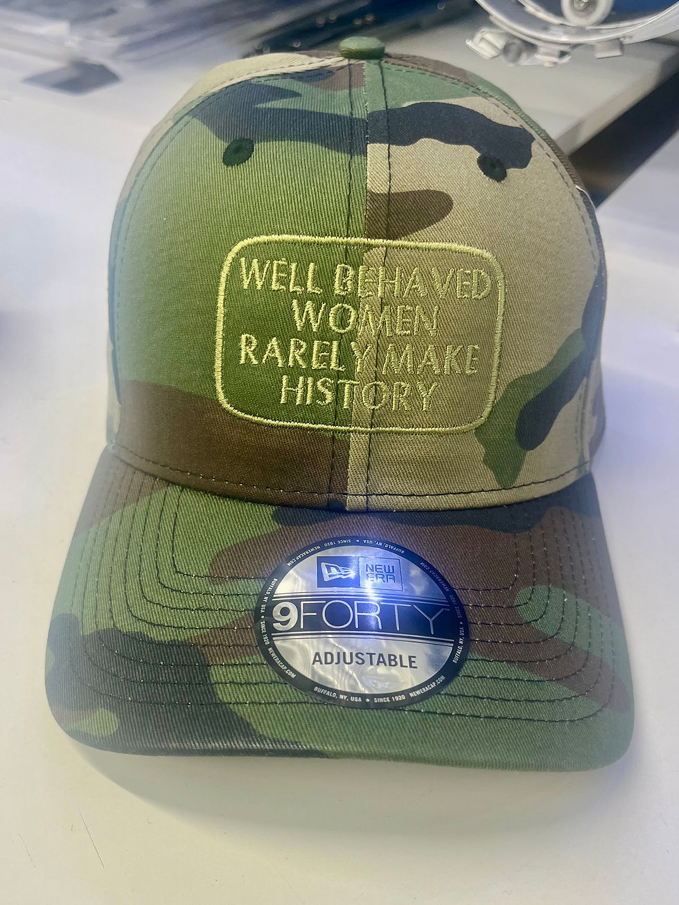 Stand out with style and attitude in this Limited Edition New Era 9FORTY Cap, featuring a bold woodland camo print and exclusive embroidered text: "Well Behaved Women Rarely Make History" in your choice of Green, Dusky Pink or Bright Pink.